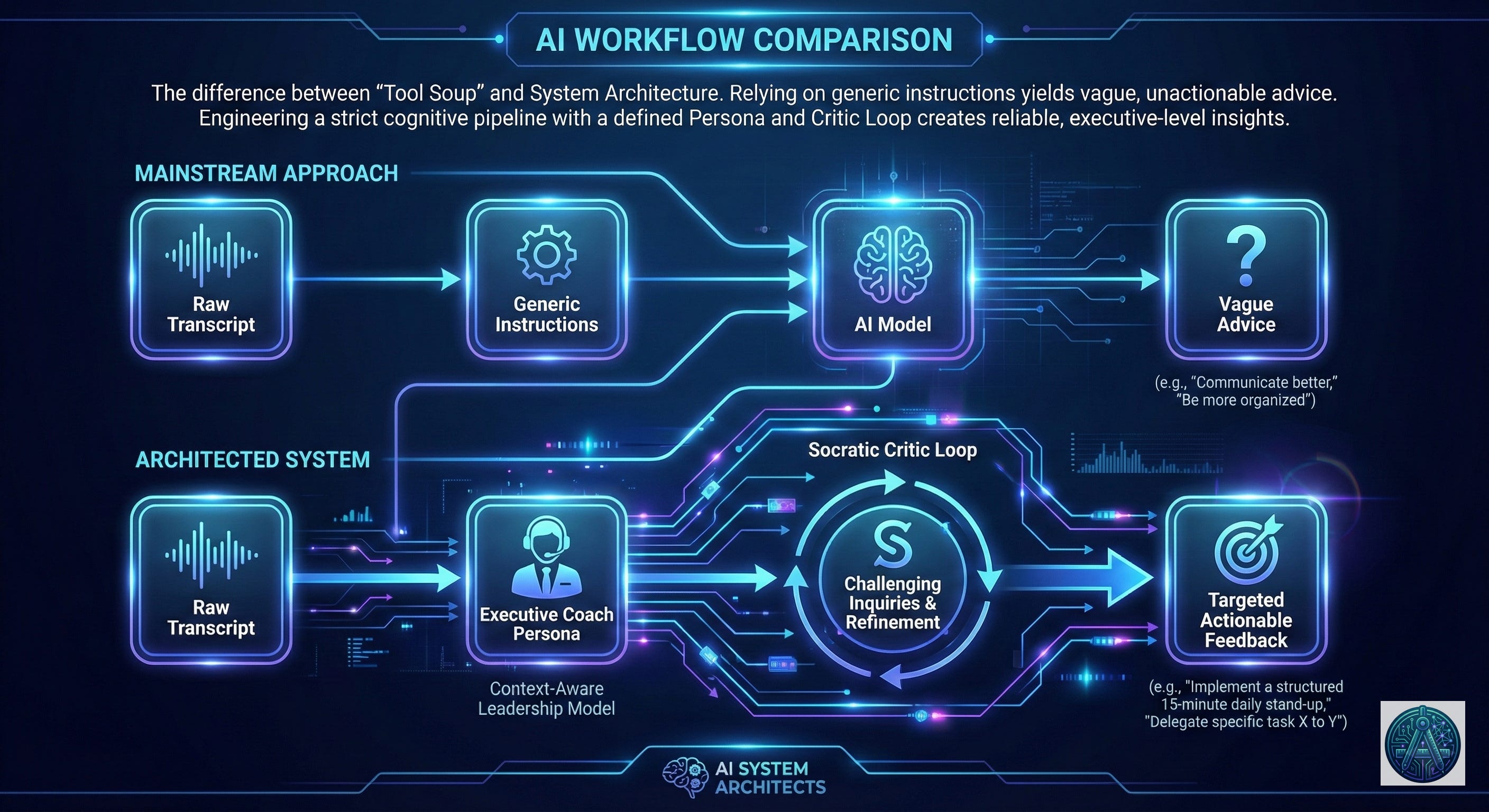 The Architect’s View: This accepts the AI’s first draft of feedback without a Critic Loop. It assumes the AI defaults to being an expert executive coach. If you ask a generic question, you get a generic, fortune-cookie answer.